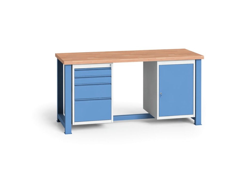 Dílenský stůl KOVONA, 1 závěsná skříňka a 4 zásuvky na nářadí, buková spárovka, pevné nohy, 1700 mm