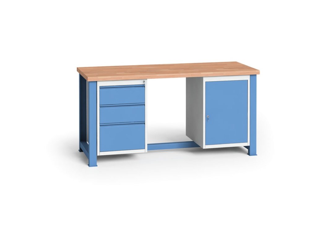 Dílenský stůl KOVONA, 1 závěsná skříňka a 3 zásuvky na nářadí, buková spárovka, pevné nohy, 1700 mm
