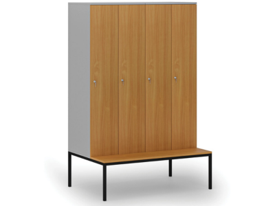 Dřevěná šatní skříňka S4 s lavičkou, 4 oddíly, 1871 x 1200 x 500/800 mm, demont, cylindrický zámek, šedá/zelená