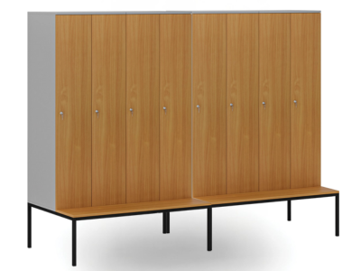 Základnu tvoří kovová lavička vysoká 373 mm s laminovaným sedákem (hloubka 300 mm). Umožňuje pohodlné sezení i převlékání přímo u skříňky a šetří místo, které by jinak zabrala samostatná lavice.