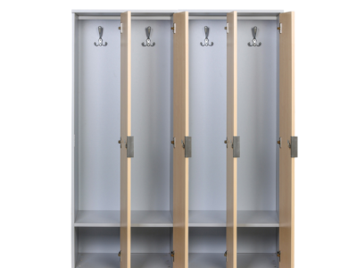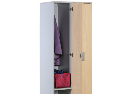 Celodřevěná šatní skříňka vnáší do prostoru příjemný a reprezentativní vzhled. Oproti kovovým skříňkám lépe zapadne do interiérů a zaměstnaneckých zázemí, kde hraje svou roli nejen funkčnost, ale i estetika. Skříňka je vyrobena z laminované dřevotřísky (18 mm), která je olepena po celém obvodu 1 mm ABS hranou. Povrch skříňky je snadno omyvatelný.