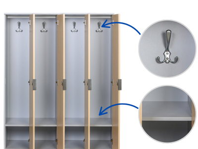 Skříňku lze dle potřeby dovybavit i příslušenstvím, jako jsou například police, boxy na boty, vnitřní přepážky nebo doplňkové háčky a jmenovky. Konkrétní produkty naleznete v příslušenství k produktu.