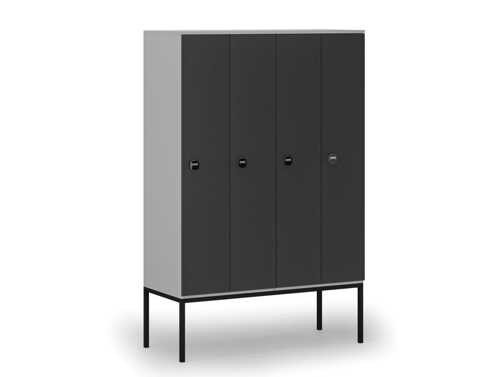 Dřevěná šatní skříňka s podnoží, 4 oddíly, 1871 x 1200 x 500 mm, demont, RFID zámek, šedá/grafit