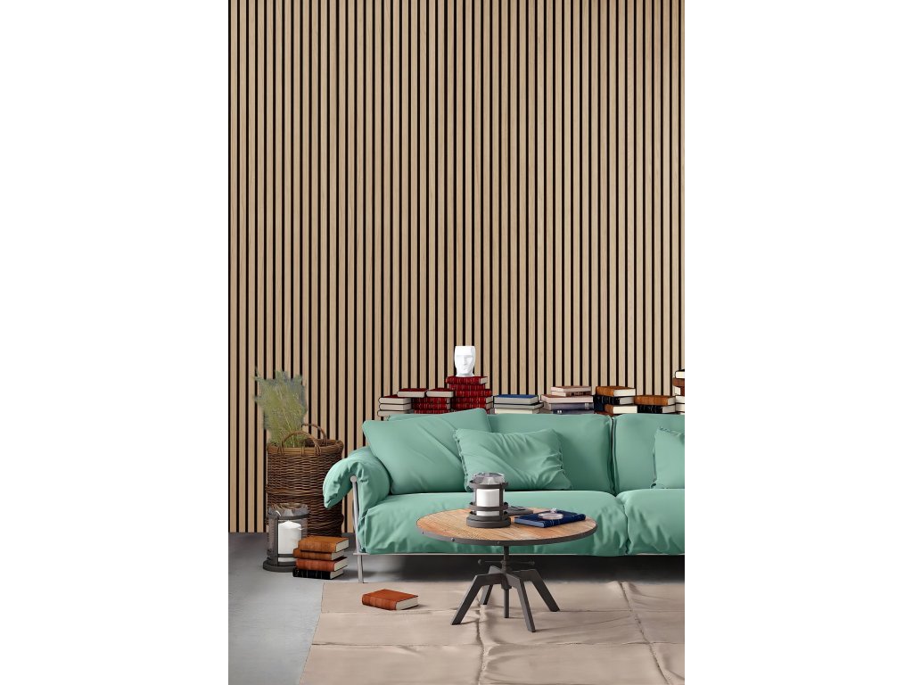 Aby akustické panely skvěle zapadly do moderních interiérů, ve kterých je kladen důraz na design a estetiku, je 9 mm hrubý polyesterový panel obložen 27 mm širokými a 12 mm hrubými MDF lamelami a rozestup mezi nimi činí 13 mm.