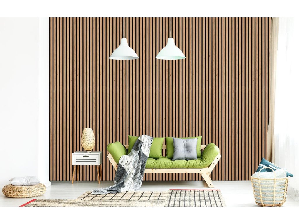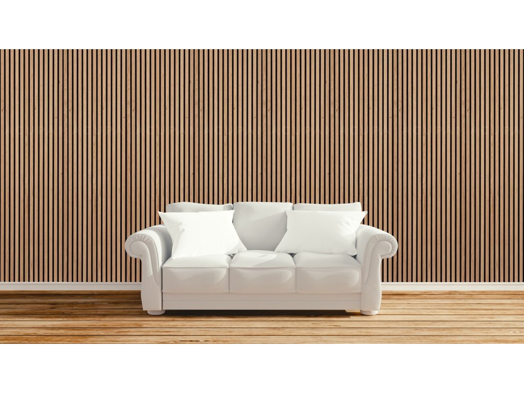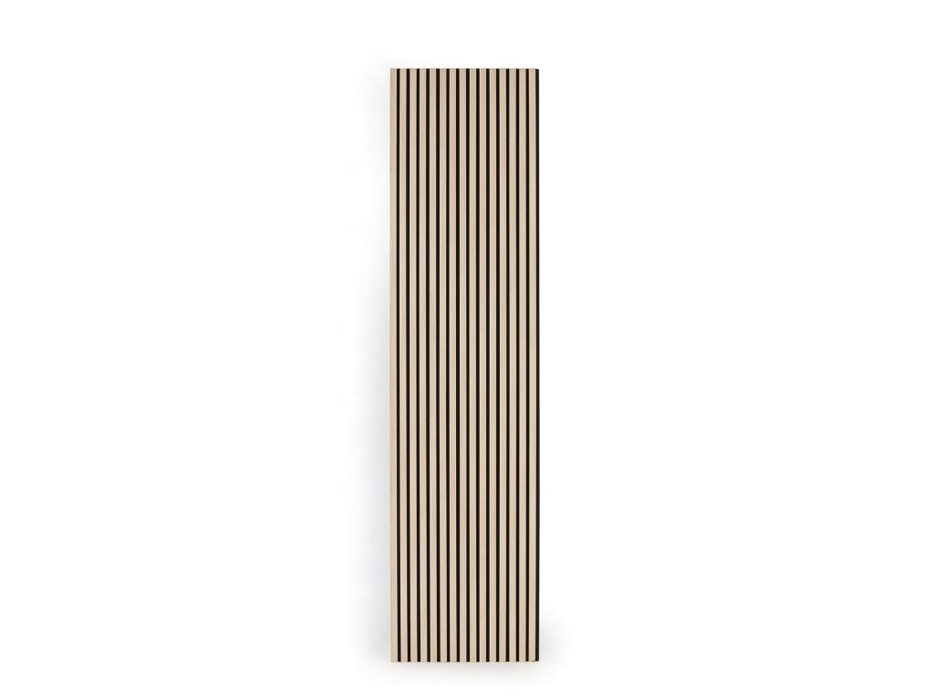 Aby akustické panely skvěle zapadly do moderních interiérů, ve kterých je kladen důraz na design a estetiku, je 9 mm hrubý polyesterový panel obložen 27 mm širokými a 12 mm hrubými MDF lamelami a rozestup mezi nimi činí 13 mm.