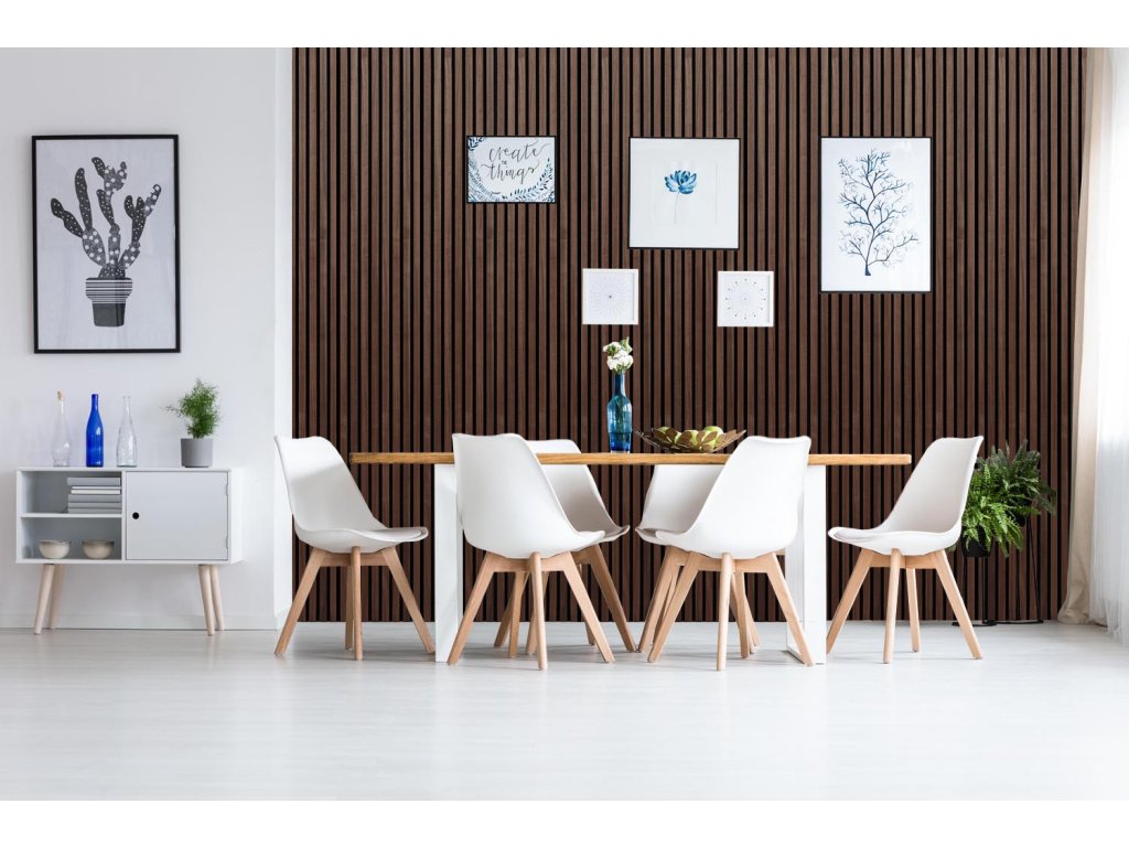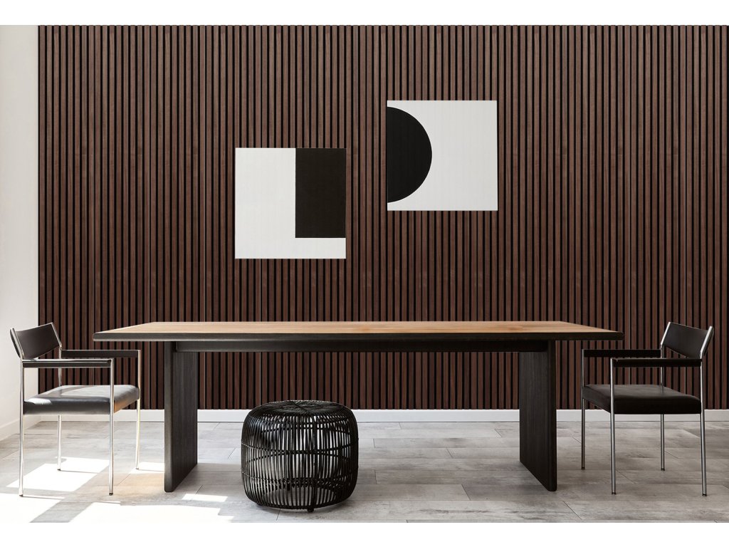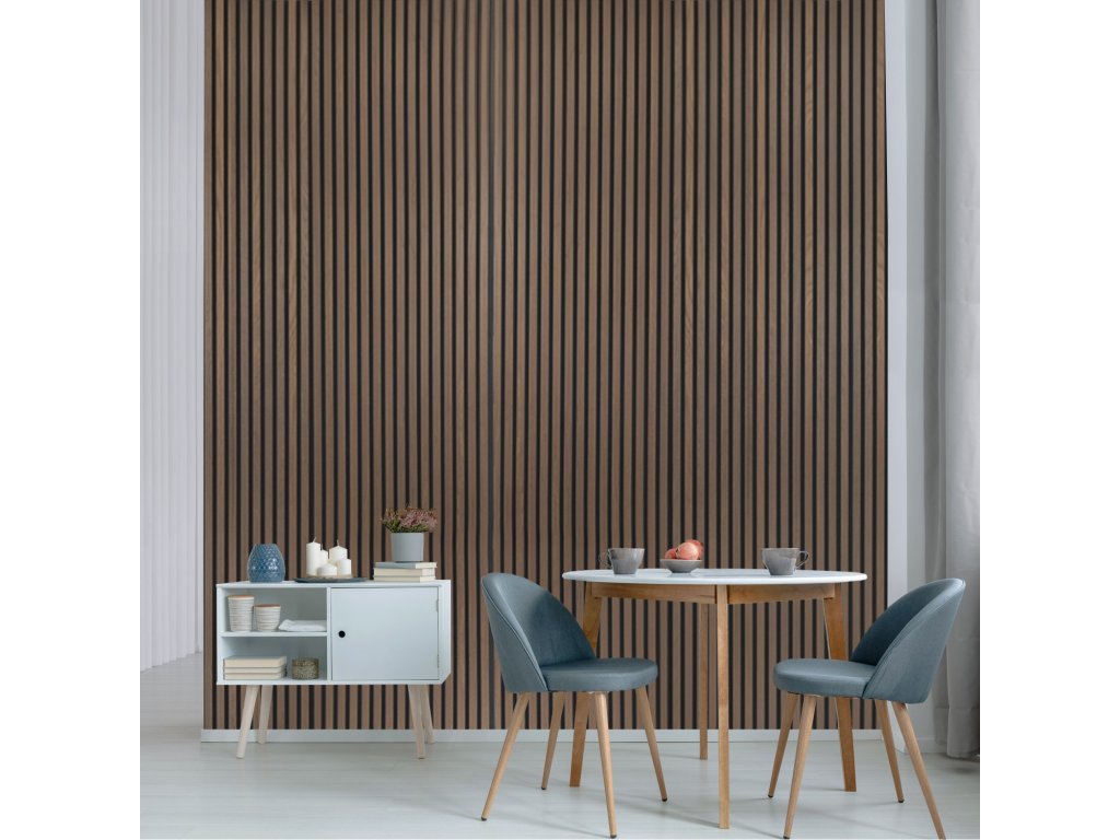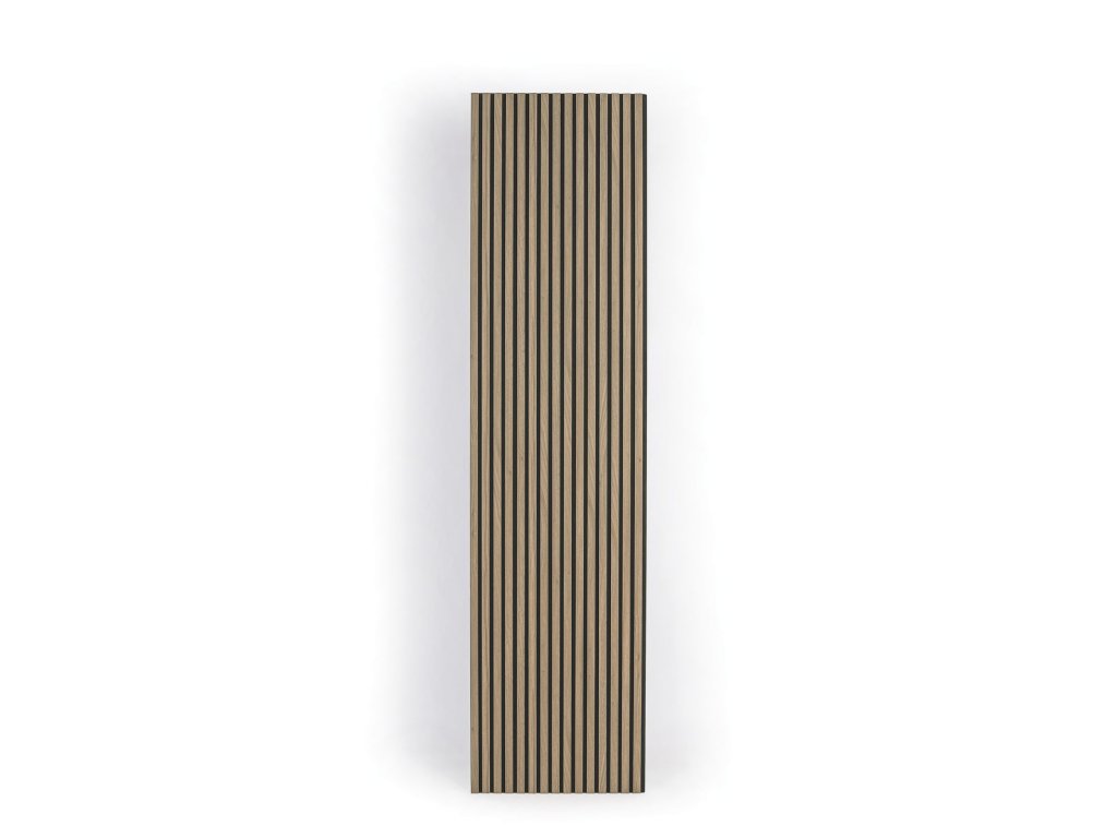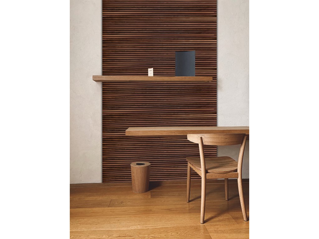 Aby akustické panely skvěle zapadly do moderních interiérů, ve kterých je kladen důraz na design a estetiku, je 9 mm hrubý polyesterový panel obložen 27 mm širokými a 12 mm hrubými MDF lamelami a rozestup mezi nimi činí 13 mm.