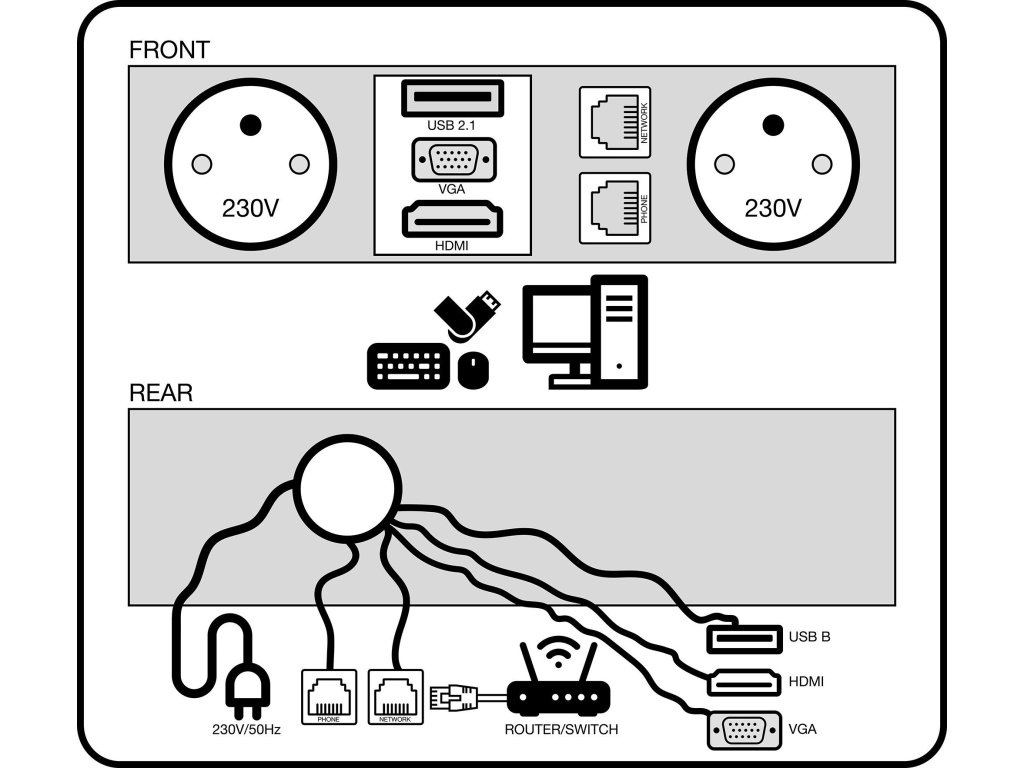 - umožňuje připojit monitory, projektory, počítače i síťová zařízení přímo ze stolu