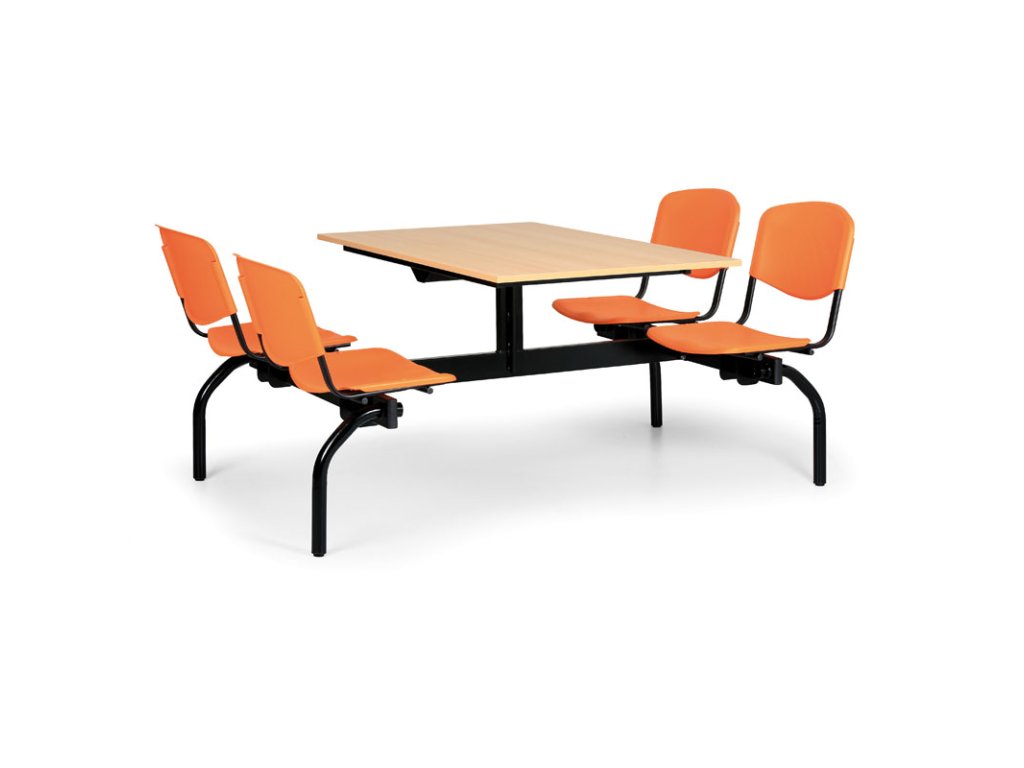 Největší výhodou jídelních setů je možnost fixace na zvoleném místě, snadné udržování pořádku a velmi snadný úklid podlahy bez nutnosti zvedání židlí. Konstrukce je vyrobena z masívních uzavřených profilů s povrchovou úpravou práškovým lakem. Každá z nohou je opatřena seřizovatelnou fixací k vyrovnání případných nerovností podlahy. Sedáky a opěráky jsou vyrobeny z odolného plastu, nebo z bukové překližky opatřené bezbarvým odolným lakem. Desky jídelního stolu jsou z laminované dřevotřísky, hrany desky jsou olepeny vysoce odolnou plastovou hranou ABS o síle 2mm. Dodává se v demontovaném stavu, montáž je jednoduchá s pomocí přiloženého montážního materiálu. Výška stolové desky je 778 mm.