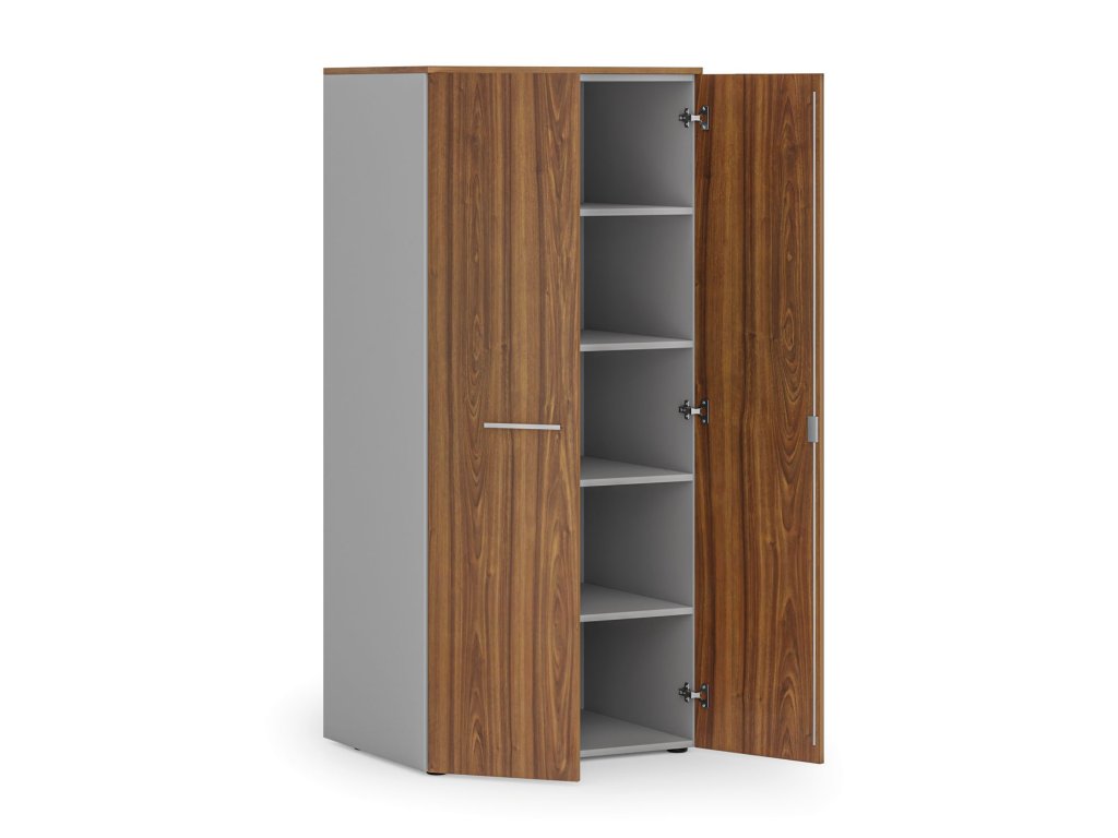 Skříň je opatřena klasickými dveřmi, které skvěle zapadnou do prostorného interiéru. Pokud potřebujete bezpečně uschovat důležité pracovní dokumenty a šanony, přijde vhod použité centrální zamykání. Estetickou stránku dveří doplňují kvalitní nadčasové úchytky z leštěného hliníku. Součástí dodávky jsou 2 klíče.