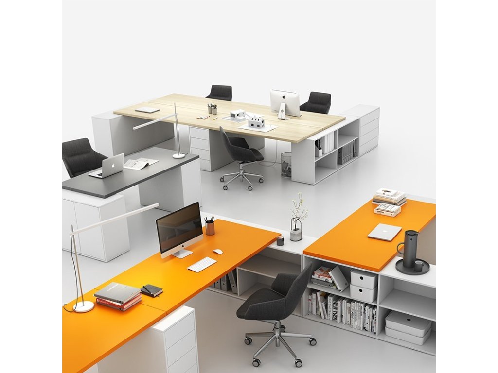 Stolové desky řady BLOCK máme v naší nabídce ve třech barevných variantách – grafitová, oranžová a v dezénu přírodního dubu. Součástí sestav jsou kromě stolové desky také různé kombinace otevřených skříněk a kancelářských kontejnerů, které nabízí pestrý mix úložného prostoru.