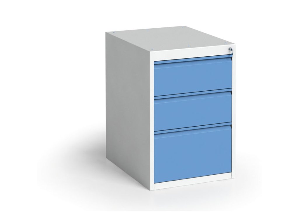 Kontejnery uloženy na spojovací podélné traverze, v horní části jsou přímo šroubovány na spodní část pracovní desky. Kontejnery jsou vyrobeny z ocelového plechu, zásuvky s nosností 40 kg jsou usazeny v kvalitních pojezdech na kuličkových ložiscích s 90% výsuvem. Zásuvky jsou uzamykatelné centrálním cylindrickým zámkem se dvěma klíči. Povrchová úprava práškovaným lakem - rám šedé barvy, zásuvky modré barvy v odstímu RAL 5012.