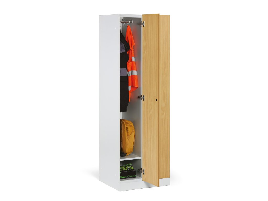 Kovová šatní skříňka s laminovanými dveřmi představuje elegantní kompromis - spojuje maximální odolnost ocelové konstrukce (0,6 mm) s reprezentativností dřeva.
