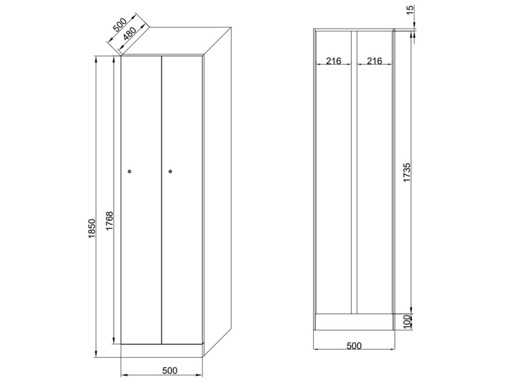 Skříňku tvoří 2 části o šířce oddílu 250 mm. Zúžené provedení je ideální tam, kde je potřeba šetřit místem – například v úzkých chodbách, předsíních nebo menších šatnách. Přesto poskytuje dostatek prostoru pro uložení osobních věcí i běžného oblečení.