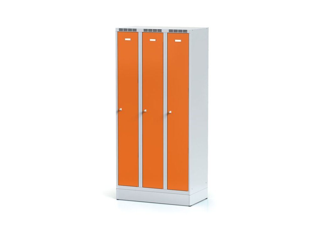 Kovová šatní skříňka na soklu, 3 oddíly, 1920 x 900 x 500 mm, otočný zámek, oranžové dveře