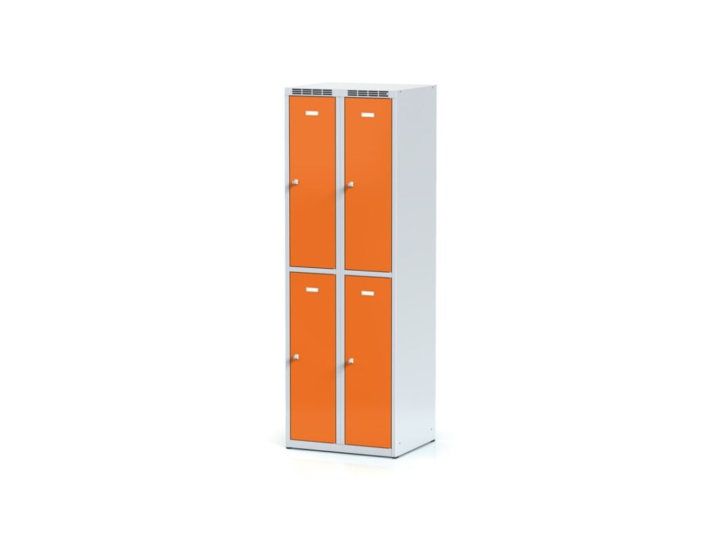 Potřebujete umístit větší množství šatních skříněk pro zaměstnance, návštěvníky, žáky či studenty a máte k dispozici omezené prostory? Řešením jsou šatní skříňky se 2 oddíly nad sebou. Tyto skříňky se skvěle hodí například do škol, sportovních hal, fitcenter, kde se nepředpokládá skladování pracovního oblečení. Každý oddíl je vysoký cca 850 mm a je vybaven šatní tyčí se 2 háčky. Dokoupit lze i přídavnou polici.