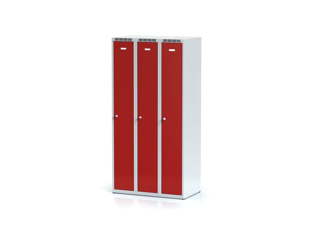 Kovová šatní skříňka, 3 oddíly, 1800 x 900 x 500 mm, cylindrický zámek, červené dveře