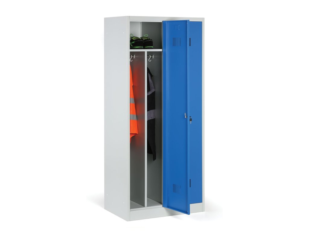Kovová šatní skříňka s mezistěnou, 2 oddíly, 1850 x 800 x 500 mm, demont, cylindrický zámek, červené dveře