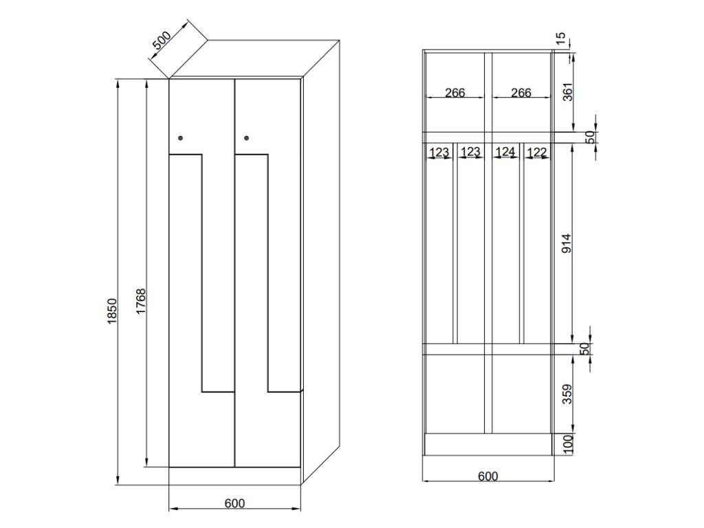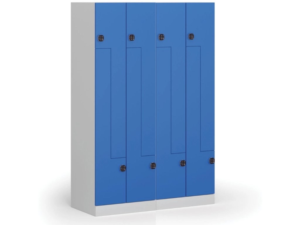 Skříňka typu Z chytře rozděluje prostor jednoho oddílu (šířka 300 mm) na horní a dolní část, přičemž každá slouží jako samostatně uzamykatelný úložný prostor. Skříňka se Z dveřmi je ideální pro 2 osoby nebo jako alternativa k širokým skříňkám s mezistěnou, kde lze oddělit civilní a pracovní oděv. Oproti klasickým skříňkám je však potřeba u skříňky Z počítat s o něco nižší výškou pro zavěšení oděvů – cca 1000 mm.