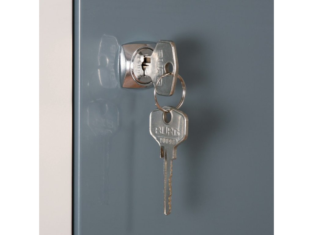 Dveře snadno uzamknete pomocí cylindrického zámku na klíč. Standardně jej dodáváme se 2 klíči v balení. Tento typ zámku je běžnou volbou pro individuálně přidělené skříňky.