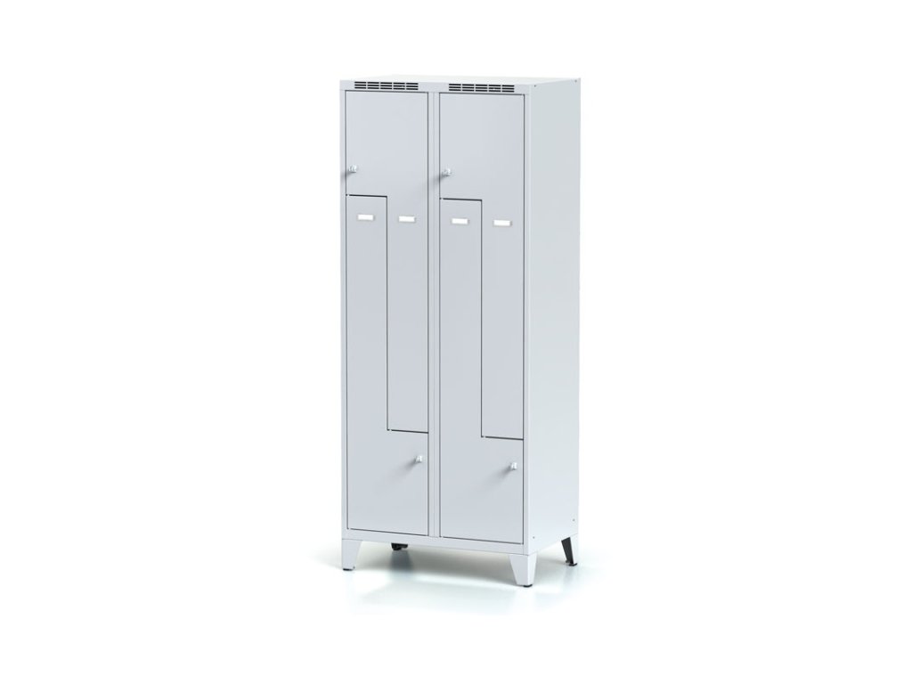 Kovová šatní skříňka Z na nohách, 4 oddíly, 1920 x 800 x 500 mm, cylindrický zámek, šedé dveře
