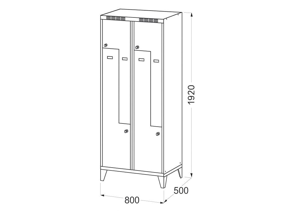 Skříňka typu Z chytře rozděluje prostor jednoho oddílu (šířka 400 mm) na horní a dolní část, přičemž každá slouží jako samostatně uzamykatelný úložný prostor. Skříňka se Z dveřmi je ideální pro 2 osoby nebo jako alternativa k širokým skříňkám s mezistěnou, kde lze oddělit civilní a pracovní oděv. Oproti klasickým skříňkám je však potřeba u skříňky Z počítat s o něco nižší výškou pro zavěšení oděvů – cca 1000 mm.