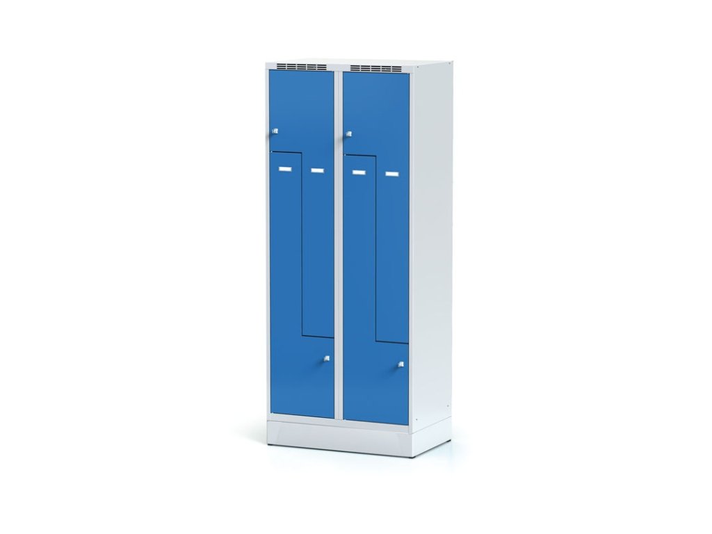 Skříňka typu Z chytře rozděluje prostor jednoho oddílu (šířka 400 mm) na horní a dolní část, přičemž každá slouží jako samostatně uzamykatelný úložný prostor. Skříňka se Z dveřmi je ideální pro 2 osoby nebo jako alternativa k širokým skříňkám s mezistěnou, kde lze oddělit civilní a pracovní oděv. Oproti klasickým skříňkám je však potřeba u skříňky Z počítat s o něco nižší výškou pro zavěšení oděvů – cca 1000 mm.