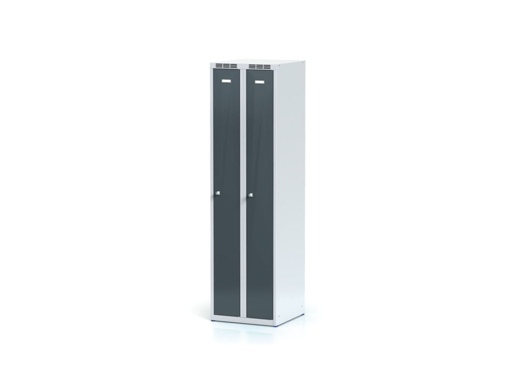 Zúžená kovová šatní skříňka S6, 2 oddíly, 1800 x 500 x 500 mm, cylindrický zámek, tmavě šedé dveře