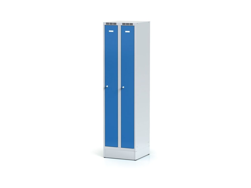 Zúžená kovová šatní skříňka na soklu, 2 oddíly, 1920 x 500 x 500 mm, otočný zámek, modré dveře