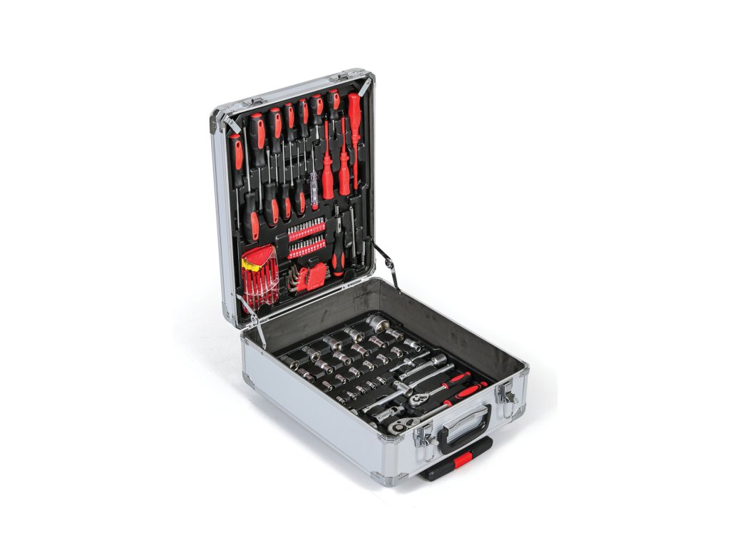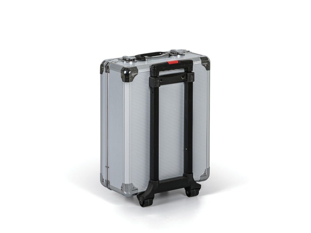 Všechno nářadí z této poloprofesionální sady je přehledně uspořádáno v plastovém kufříku s kolečky a praktickým teleskopickým madlem o rozměrech 500 x 370 x 205 mm, takže ho můžete jednoduše přenášet a mít neustále po ruce. Hmotnost kufříku vč. vybavení činí 11.7 kg.