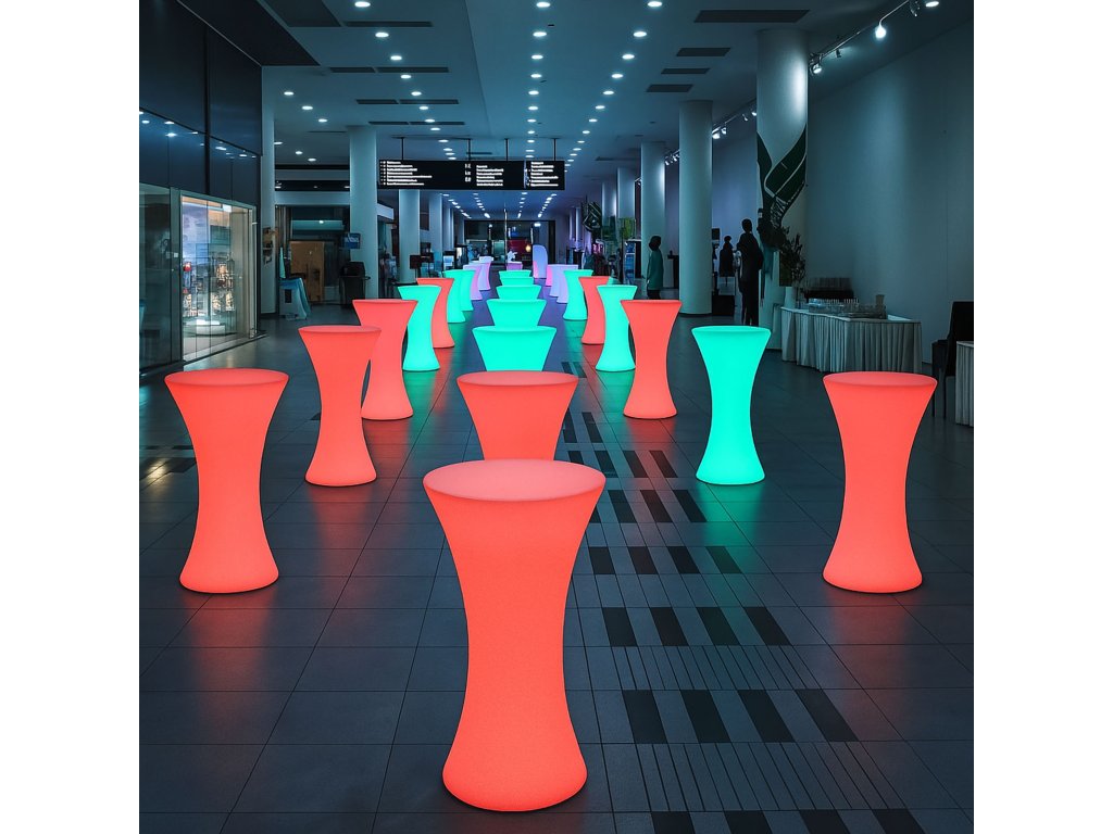 Vneste do svého prostoru styl, barvy a moderní atmosféru díky LED svítícímu barovému nábytku! Tento designový kousek z odolného plastu PE rozzáří interiér i exteriér až 16 různými barvami, které jednoduše ovládáte dálkovým ovladačem. Nechybí také efekty jako blikání, několik typů barevných přechodů (flash, strobe, fade, smooth). Díky dobíjecí baterii, vysoké odolnosti a vodotěsnosti IP65 je tento nábytek ideální volbou nejen do domácností, ale i pro komerční využití – do barů, hotelů, na zahradní party nebo třeba do showroomů.