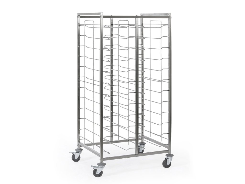 Dvouřadý nerezový vozík nabízí zvýšenou kapacitu při zachování stability a mobility. Ideální volba pro provozy s vysokým počtem táců a potřebou efektivní manipulace. Konstrukce je robustní a snadno čistitelná, kolečka umožňují snadný pohyb i zatáčení v úzkých prostorách.