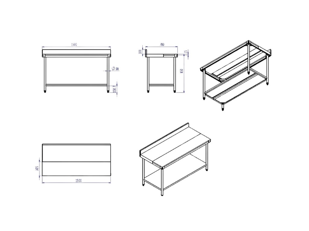 - pracovní deska s tloušťkou plechu 0,8 mm, dodávána se zadním lemem výšky 100 mm