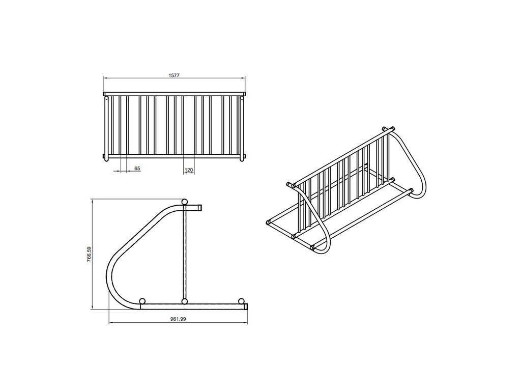 - venkovní oboustranný stojan na kola na zem s rozměry (d x h x v) 1580 x 965 x 770 mm poskytuje až 10 míst pro jízdní kola