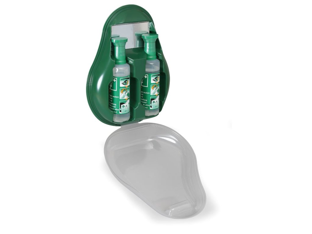 - láhev na vyplachování očí je naplněna fyziologickým roztokem a opatřena ergonomicky tvarovanou oční miskou, která umožní co nejjednodušší vypláchnutí a kapalina se tak dostane přímo na zasažené oko