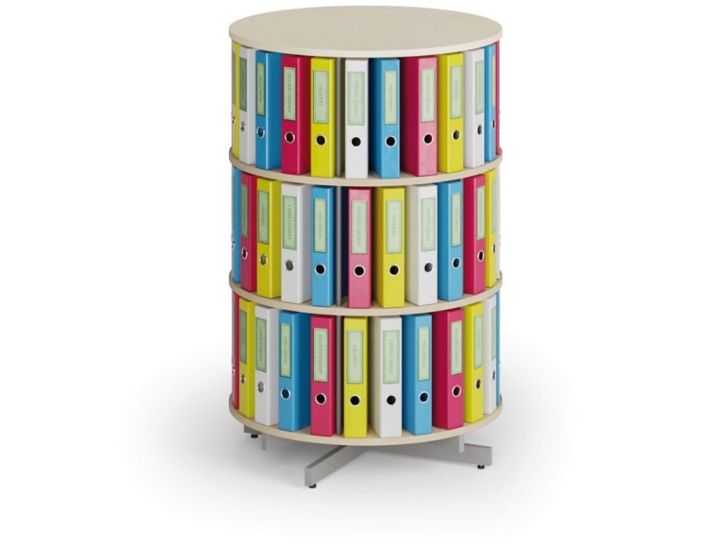 Archivační systém, který Vám ušetří prostor při archivaci Vašich písemností. Díky otočnému mechanismu lze uspořádat až 144 pořadačů, otočný sloup si vyžádá jen asi 1 m2 pro jeho umístění a pro vlastní přístup k pořadačům. Při běžném použití archivační skříně, nebo regálů na pořadače potřebujete prostor cca 2 m2. Výhoda úspory místa při použití otočných archivačních sloupů se zvyšuje úměrně s počtem instalovaných sloupů, například při použití dvou sloupů je již úspora místa 1,5 m2. Otočná skříň je posazena na otočný kříž, velmi lehké otáčení zajišťují ložiska umístěná přímo v otočném stojanu vybaveném stavěcími šrouby, které slouží k vyrovnání možných nerovností podlahy. Konstrukce skříně je samonosná, zajišťující velmi dobrou pevnost a stabilitu. Patra skříně jsou z laminované dřevotřísky s plastovu hranou zabraňujcí samovolnému vysunutí pořadače mimo obvod skříně. Patro je možno otočit, čímž vznikne deska bez hran zabraňující samovolnému vysunutí pořadačů. Kapacita jednoho patra je 24 pořadačů. Patro tvoří kruhová laminová deska o průměru 80 cm. Všechna patra se otáčejí najednou. Lze vytvořit až šestipatrouvou archivační otočnou skříň. Standardní barevné provedení je v šedé a černé barvě. Pořadače na fotografiích nejsou součástí dodávky. Skříň je dodávána v kartonu s návodem k jednoduché montáži.