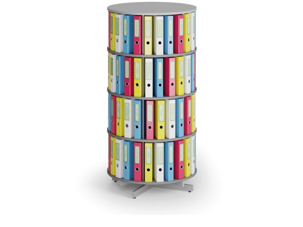 Archivační systém, který Vám ušetří prostor při archivaci Vašich písemností. Díky otočnému mechanismu lze uspořádat až 144 pořadačů, otočný sloup si vyžádá jen asi 1 m2 pro jeho umístění a pro vlastní přístup k pořadačům. Při běžném použití archivační skříně, nebo regálů na pořadače potřebujete prostor cca 2 m2. Výhoda úspory místa při použití otočných archivačních sloupů se zvyšuje úměrně s počtem instalovaných sloupů, například při použití dvou sloupů je již úspora místa 1,5 m2. Otočná skříň je posazena na otočný kříž, velmi lehké otáčení zajišťují ložiska umístěná přímo v otočném stojanu vybaveném stavěcími šrouby, které slouží k vyrovnání možných nerovností podlahy. Konstrukce skříně je samonosná, zajišťující velmi dobrou pevnost a stabilitu. Patra skříně jsou z laminované dřevotřísky s plastovu hranou zabraňujcí samovolnému vysunutí pořadače mimo obvod skříně. Patro je možno otočit, čímž vznikne deska bez hran zabraňující samovolnému vysunutí pořadačů. Kapacita jednoho patra je 24 pořadačů. Patro tvoří kruhová laminová deska o průměru 80 cm. Všechna patra se otáčejí najednou. Lze vytvořit až šestipatrouvou archivační otočnou skříň. Standardní barevné provedení je v šedé a černé barvě. Pořadače na fotografiích nejsou součástí dodávky. Skříň je dodávána v kartonu s návodem k jednoduché montáži.