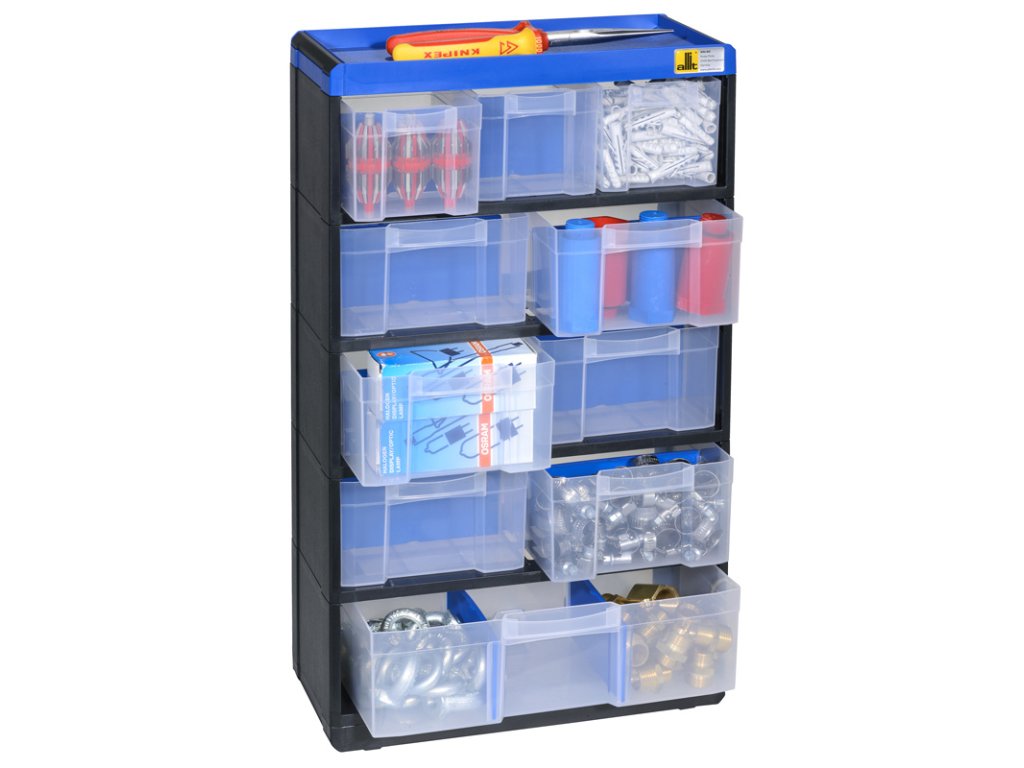 - zásuvky umožňují umístění štítků s popiskem pro lepší přehled o skladovaném materiálu