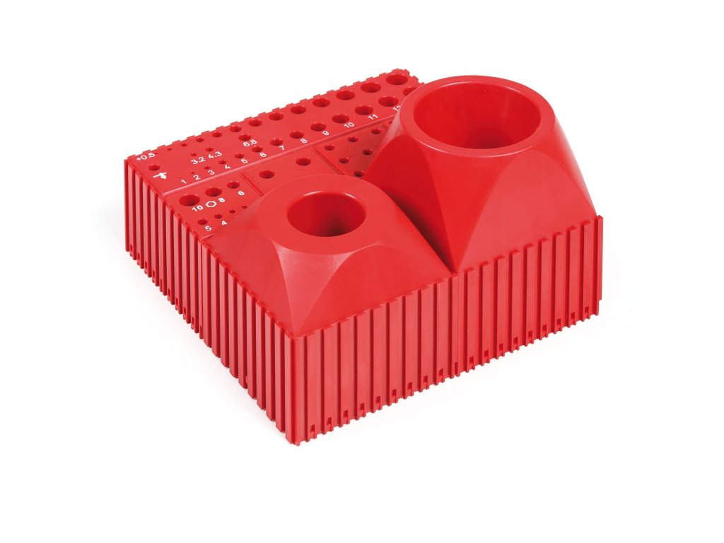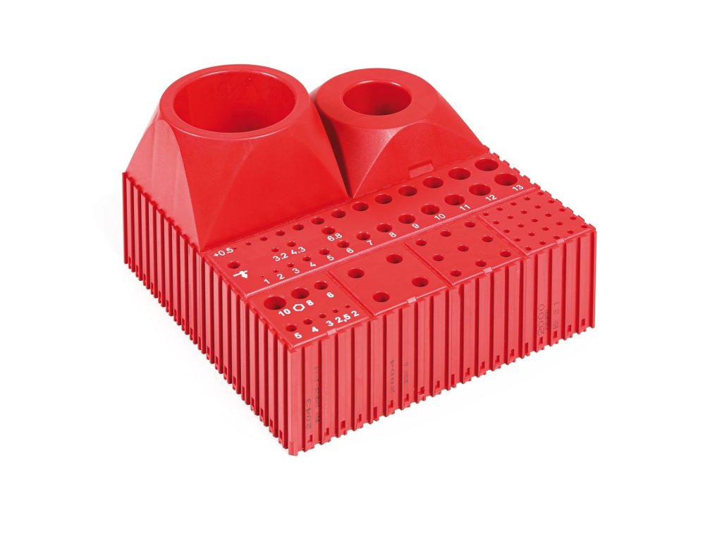 Mezi součástmi stavebnice najdete zvláštní boxy pro sady vrtáků a boxy k uložení IMBUS klíčů nebo držáku elektrod. V boxech pro vrtáky jsou průměry úložných dutin odstupňovány po 0,1mm a mají popisky. Popis urychluje nalezení potřebného vrtáku a odstupňování napomáhá ke správnému zařazení vrtáku zpět na patřičné místo.