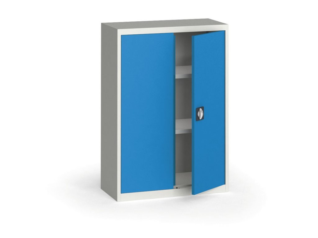 Plechová policová skříň na nářadí KOVONA, 1150 x 800 x 400 mm, 2 police, šedá/modrá
