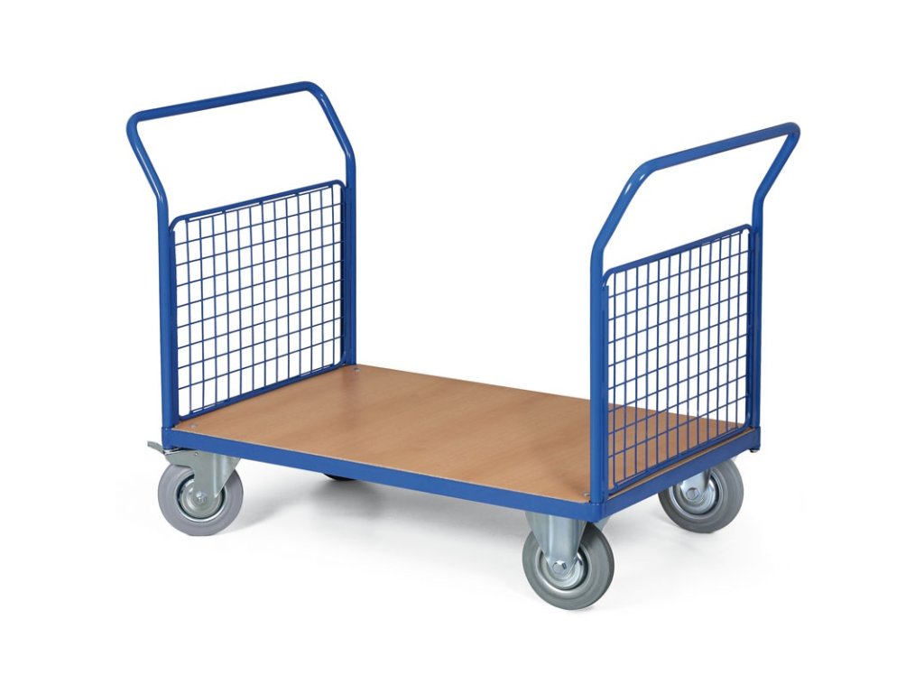 Plošinový vozík - 2 madla s drátěnou výplní, 1200x800 mm, nosnost 500 kg, kola 200 mm s šedou pryží