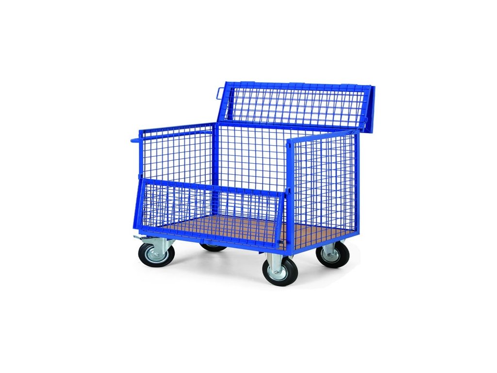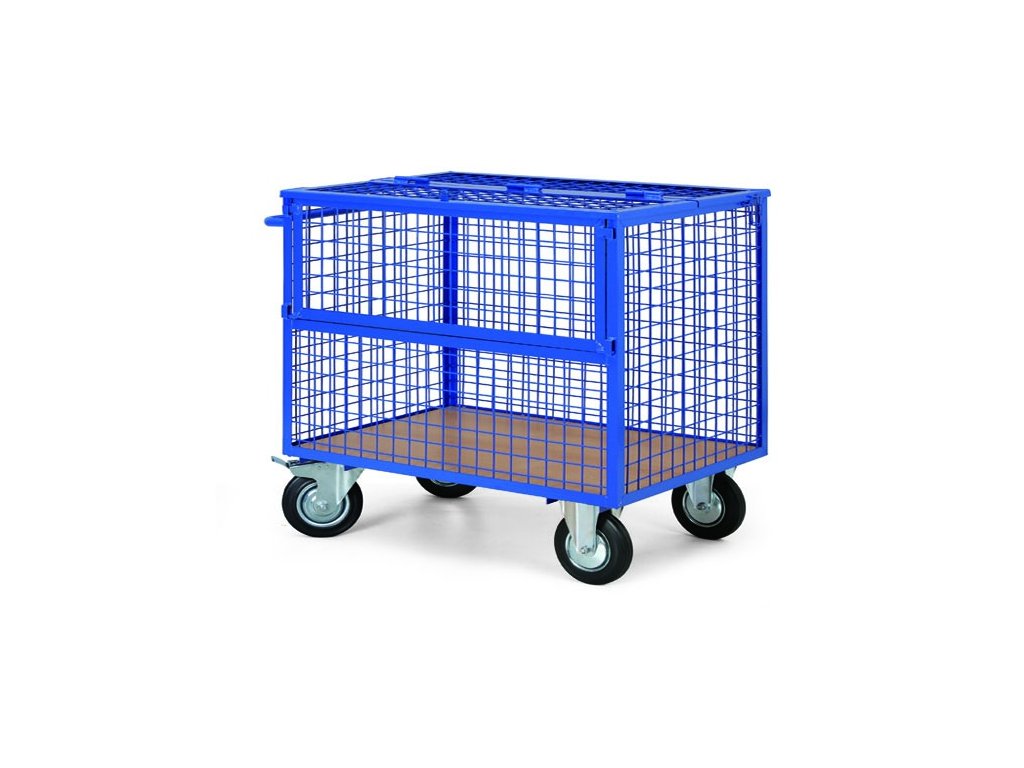 Plošinový vozík s drátěnými stěnami a uzavíratelným víkem