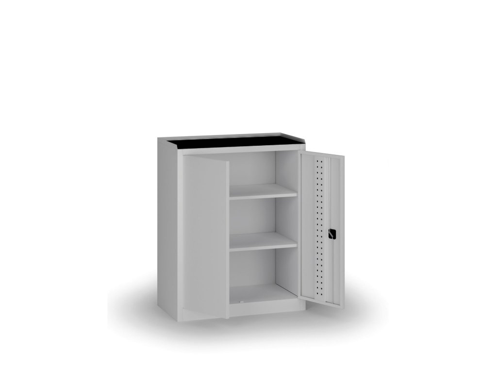 Univerzální nízká skříň pro dílenské prostředí s pevnou konstrukcí z plechu 0,7 mm. Dveře jsou perforované v systému EuroPerfo (10 × 10 mm, 38 × 38 mm), boky a zadní stěna hladké. Dvě výškově stavitelné police po 25 mm umožňují přehledné uložení nářadí.