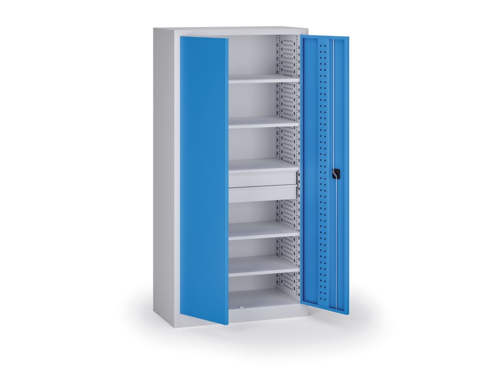 Policová dílenská skříň 2-dveřová, 5 polic + 2 zásuvky, 1950 × 950 × 500 mm, modré dveře