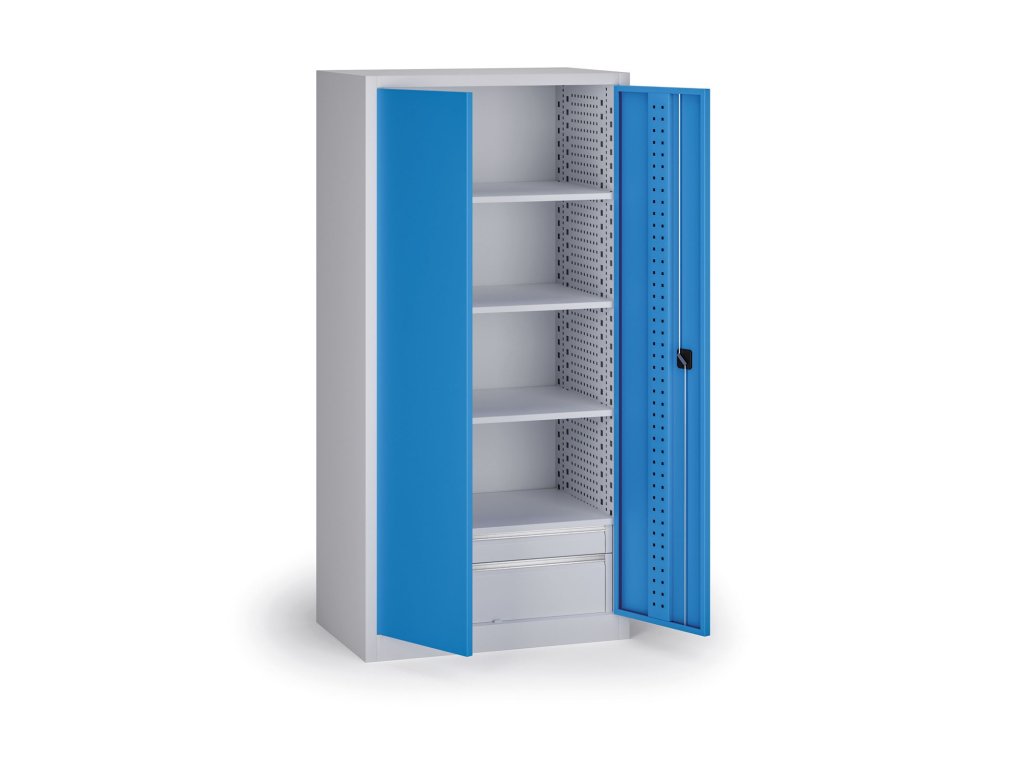 Policová dílenská skříň na nářadí KOVOS, perforovaný panel, 4 police, 2 zásuvky, 950 x 600 x 1950 mm, modrá