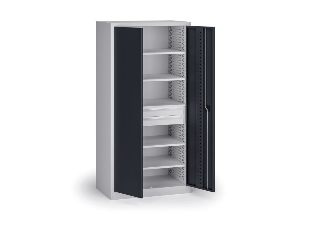 Policová dílenská skříň na nářadí KOVOS, perforovaný panel, 5 polic, 2 zásuvky, 950 x 600 x 1950 mm, grafit