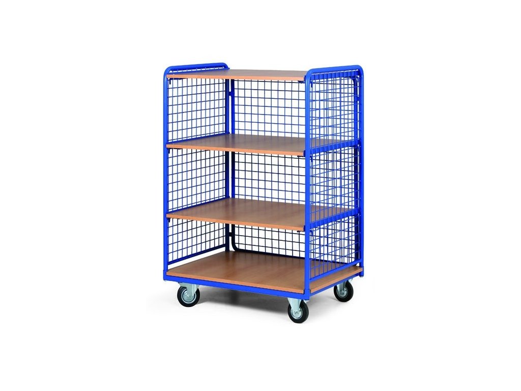 Policový vozík, 4 police, 3 bočnice s drátěnou výplní, nosnost 300 kg