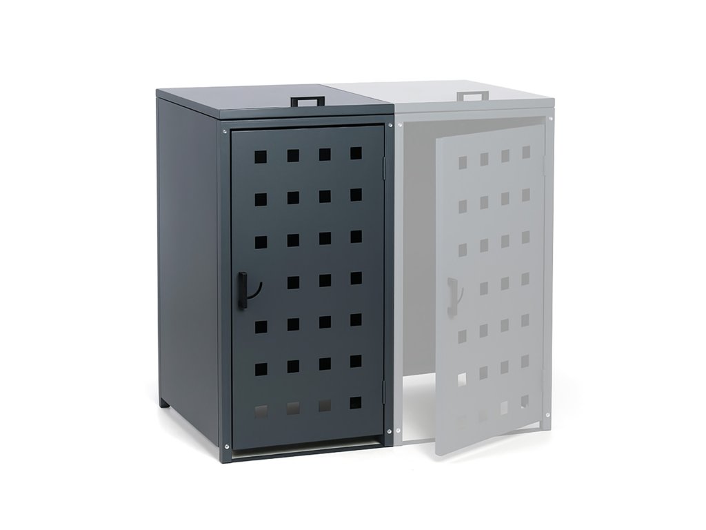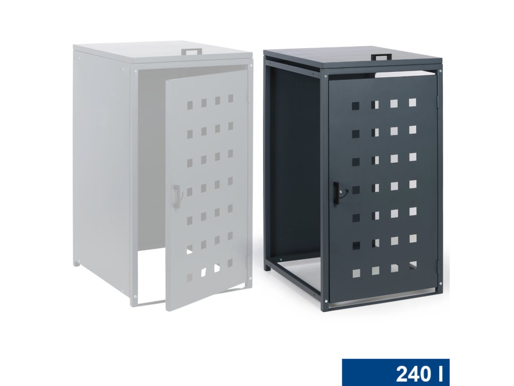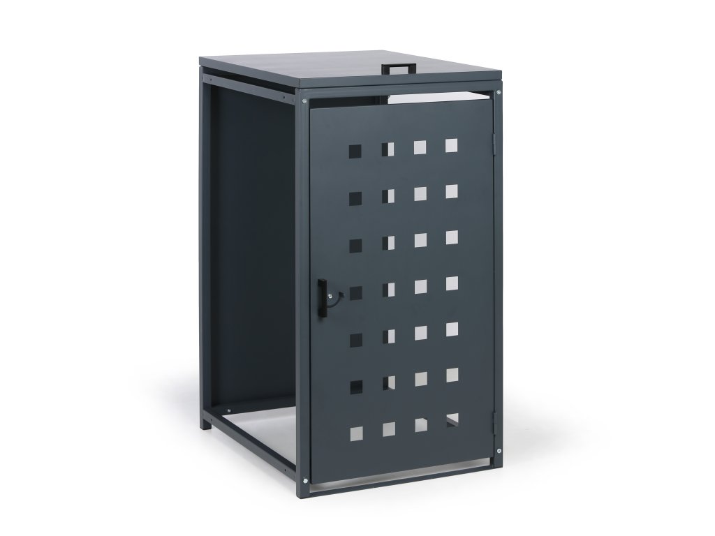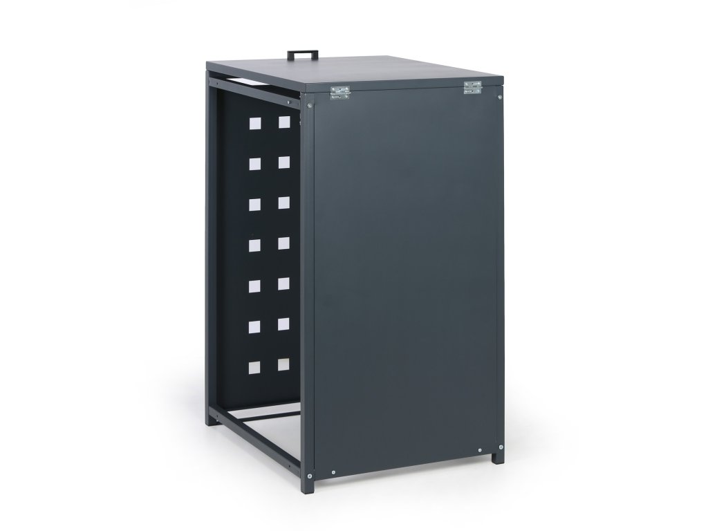 Skryjte svou popelnici díky tomuto praktickému krytu, který nejen, že působí esteticky, ale zároveň částečně ochrání popelnici před povětrnostními vlivy. Kryt na popelnici je vybaven čelními dvířky s uzavíracím mechanismem a také výklopným poklopem, o jehož aretaci k víku popelnice se stará zajišťovací řetízek. Přístřešek na popelnici je celokovový a jeho konstrukce je lakována práškovou barvou v šedém odstínu RAL 7016.