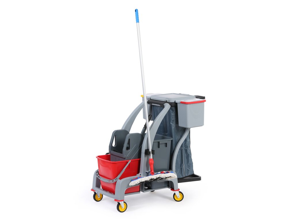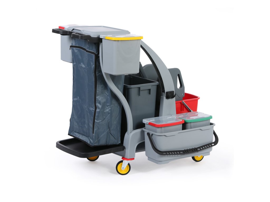 Odolná a pevná konstrukce, dostatek úložného prostoru a praktické funkce, jako jsou ergonomická rukojeť či držáky na úklidové pomůcky, zajišťují pohodlné používání a snadnou manipulaci. Barevné odlišení jednotlivých částí usnadňuje organizaci práce, zatímco měkká kolečka chrání povrchy i nábytek před poškozením.