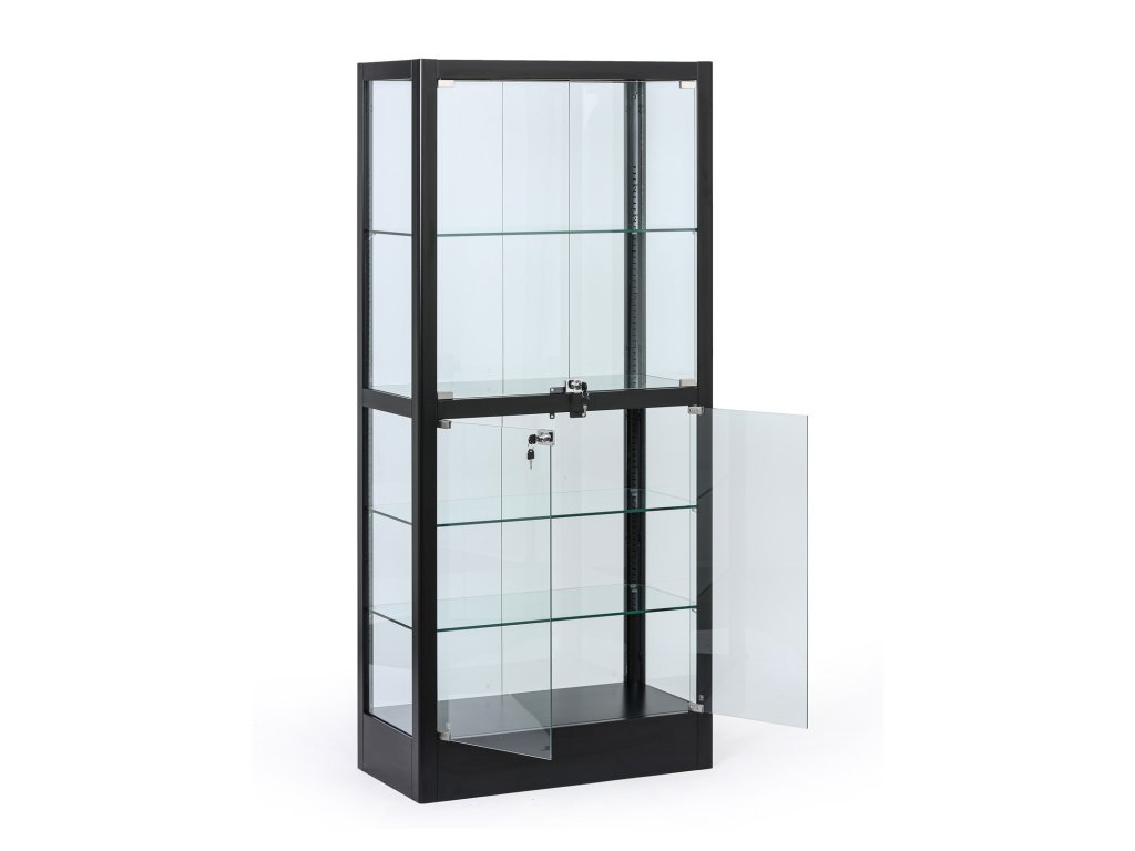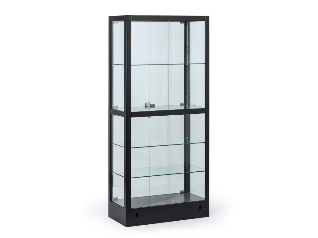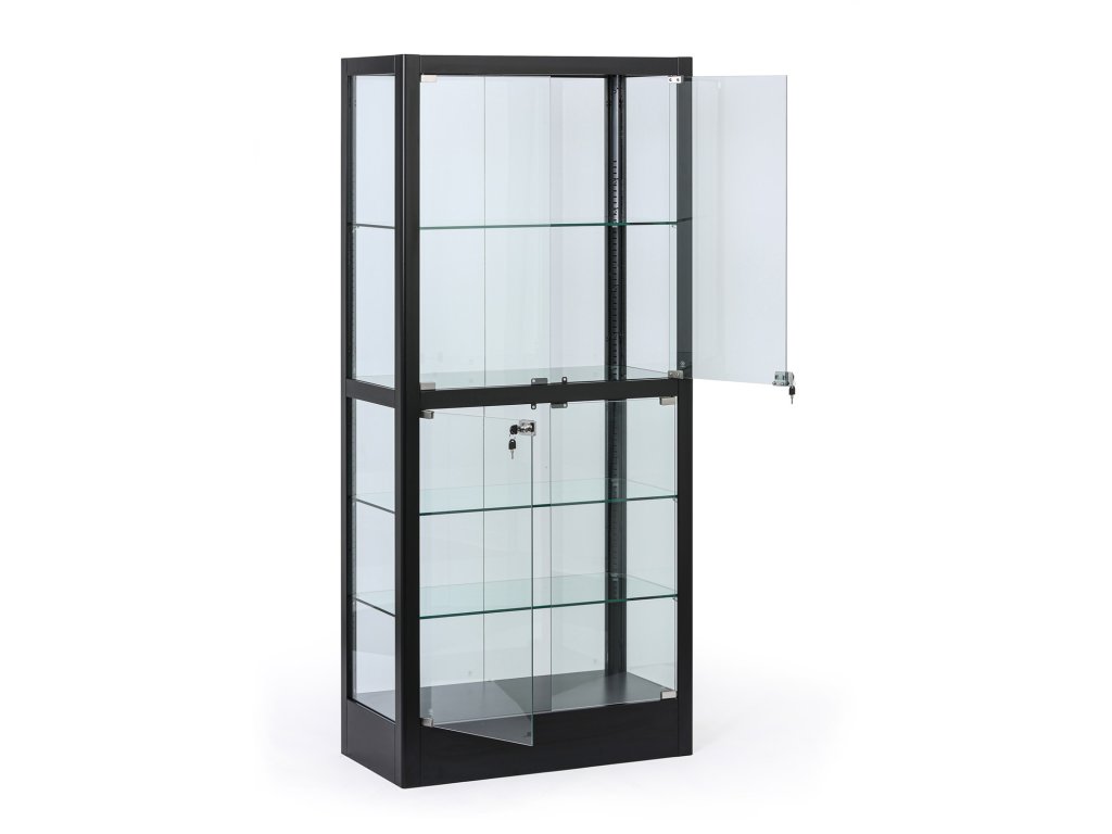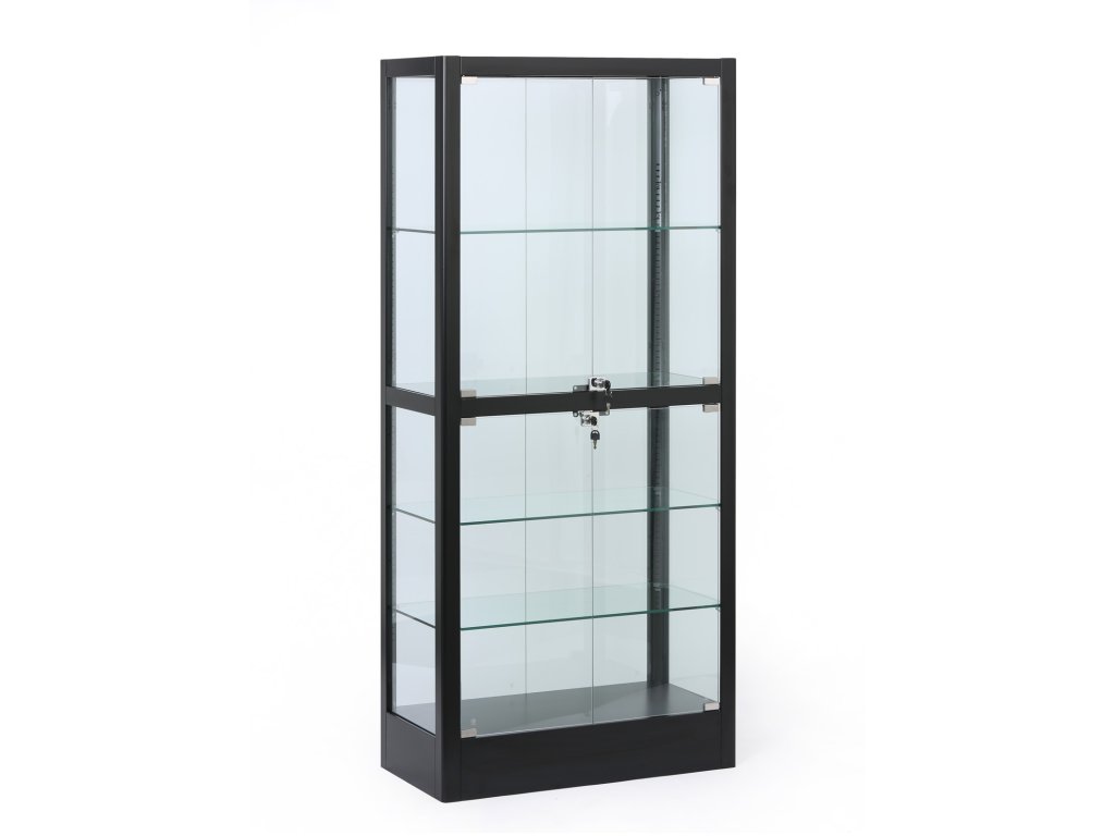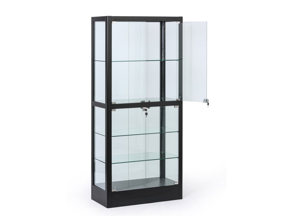 Elegantní prosklená vitrína v černém provedení nabízí prostor pro vystavení dekorací, výrobků, dokumentů i trofejí. Díky pevné kovové konstrukci, proskleným křídlovým dveřím a stavitelným skleněným policím je ideální pro kanceláře, recepce, školy, showroomy i obchody. Dvířka jsou opatřeny cylindrickým zámkem se dvěma klíči. Sokl dodává celé vitríně stabilitu i čistý elegantní vzhled.