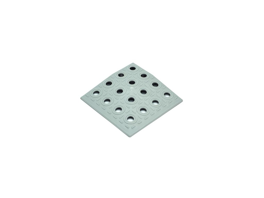 Nájezd rohový 137x137x16 mm je doplňujícím prvkem pro ukončení podlahové podlahy v rozích, kde na sebe navazují rovné nájezdy ze dvou stran. Plynulý nájezd zabezpečí bezpečný vstup a nájezd na plochu. Povrch rohu je stejně děrovaný jako základní deska, spodní strana je žebrovaná a propojená kanály, které zajišťují rychlý a trvalý odvod vody pod povrchem podlahy. Barevnou kombinací nájezdů a rohů je možné označit okraje plochy v souladu s bezpečnostními předpisy (kombinace žluté a černé). Součástí dodávky jsou 4x4 ks spojek pro spojení s dalšími prvky.